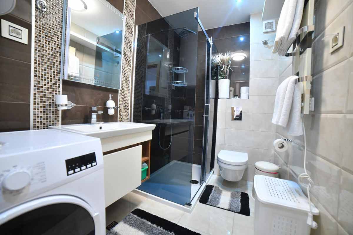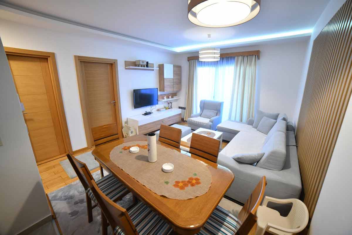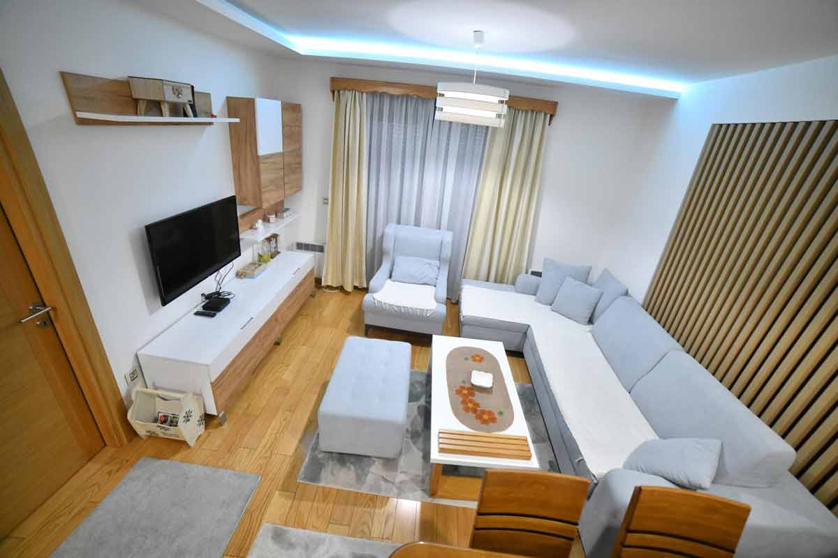 Enterijer odiše elegancijom i toplinom prirodnih tonova. Svetao dnevni boravak sa velikom ugaonom garniturom, TV-om i trpezarijom pruža osećaj potpunog komfora. Kuhinja je potpuno opremljena svim neophodnim aparatima, dok moderno kupatilo sa tuš kabinom i mašinom za veš nudi maksimalnu praktičnost.