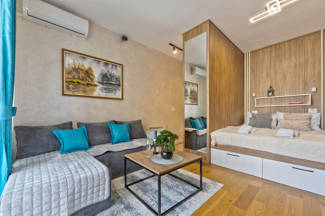 Apartman je projektovan tako da udobno smesti do 2 odrasle osobe i 2 deteta. Pored raskošnog francuskog ležaja za miran san, tu je i moderna ugaona garnitura koja se lako razvlači u dodatni ležaj, pružajući fleksibilnost neophodnu za porodični boravak.