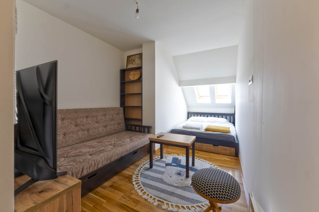 - Gornja etaža: Rezervisana za miran san sa dva velika, udobna kreveta.