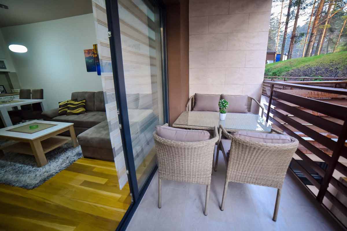 Na terasі sa garniturom za sedenje možete uživati uz jutarnju kafu i šum borova — iskustvo koje svaki boravak na Zlatiboru čini posebnim.