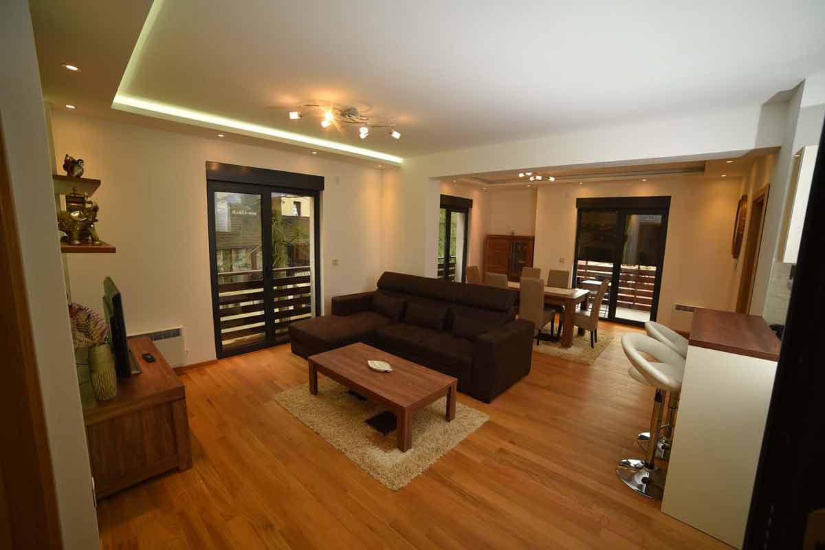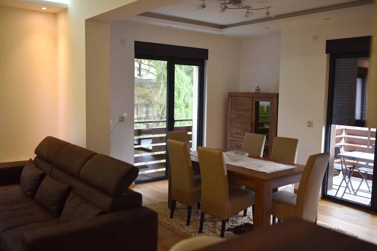 Sa 66 m² pažljivo organizovanog prostora, apartman je idealan za porodice, parove i grupe do 6 gostiju. Veliki dnevni boravak okupan prirodnim svetlom vodi na terasu sa koje se pruža pogled na zelenilo – savršeno mesto za jutarnju kafu ili večernji odmor. Trpezarijski deo je prostran, sa velikim drvenim stolom i elegantnim stolicama, dok je kuhinja potpuno opremljena za kratke i duže boravke.