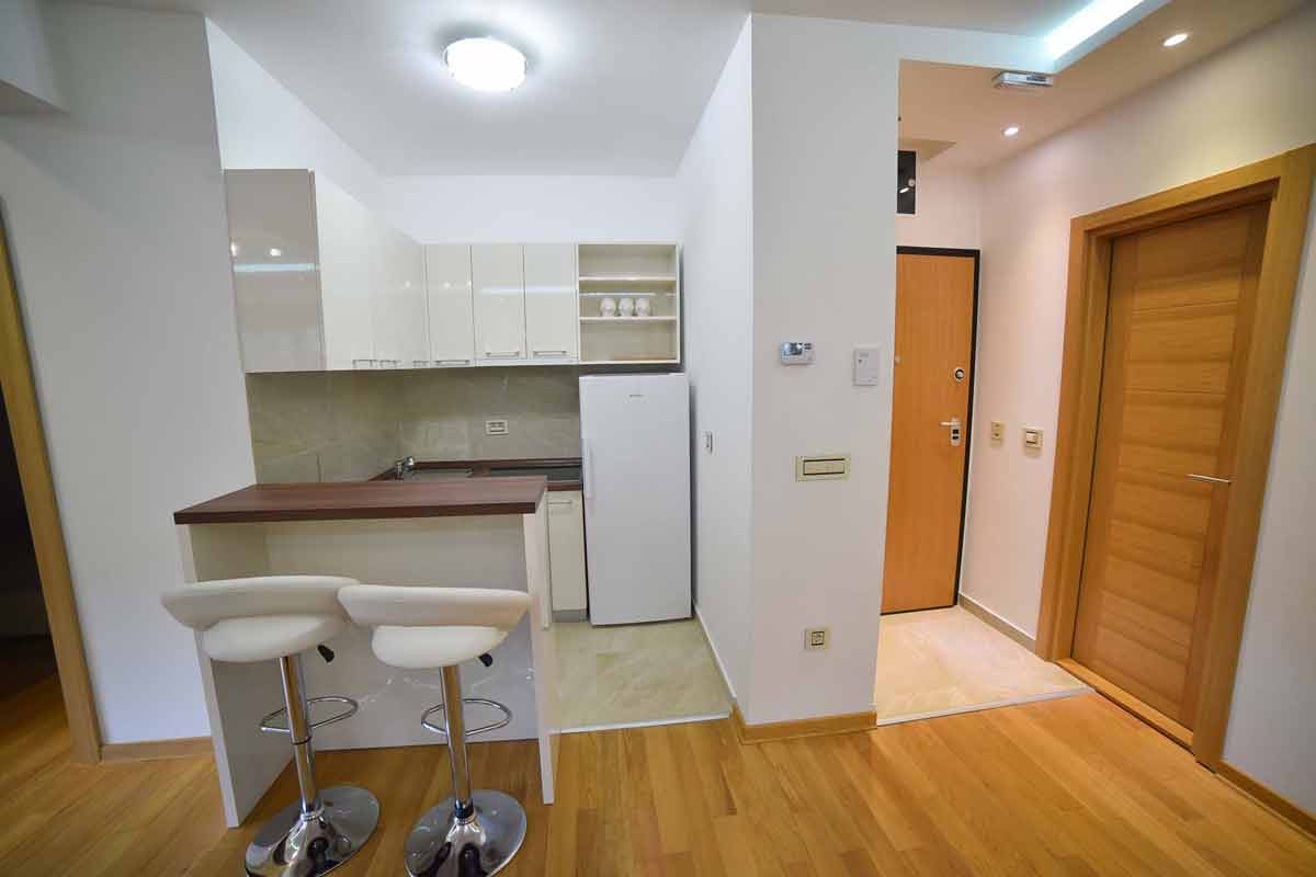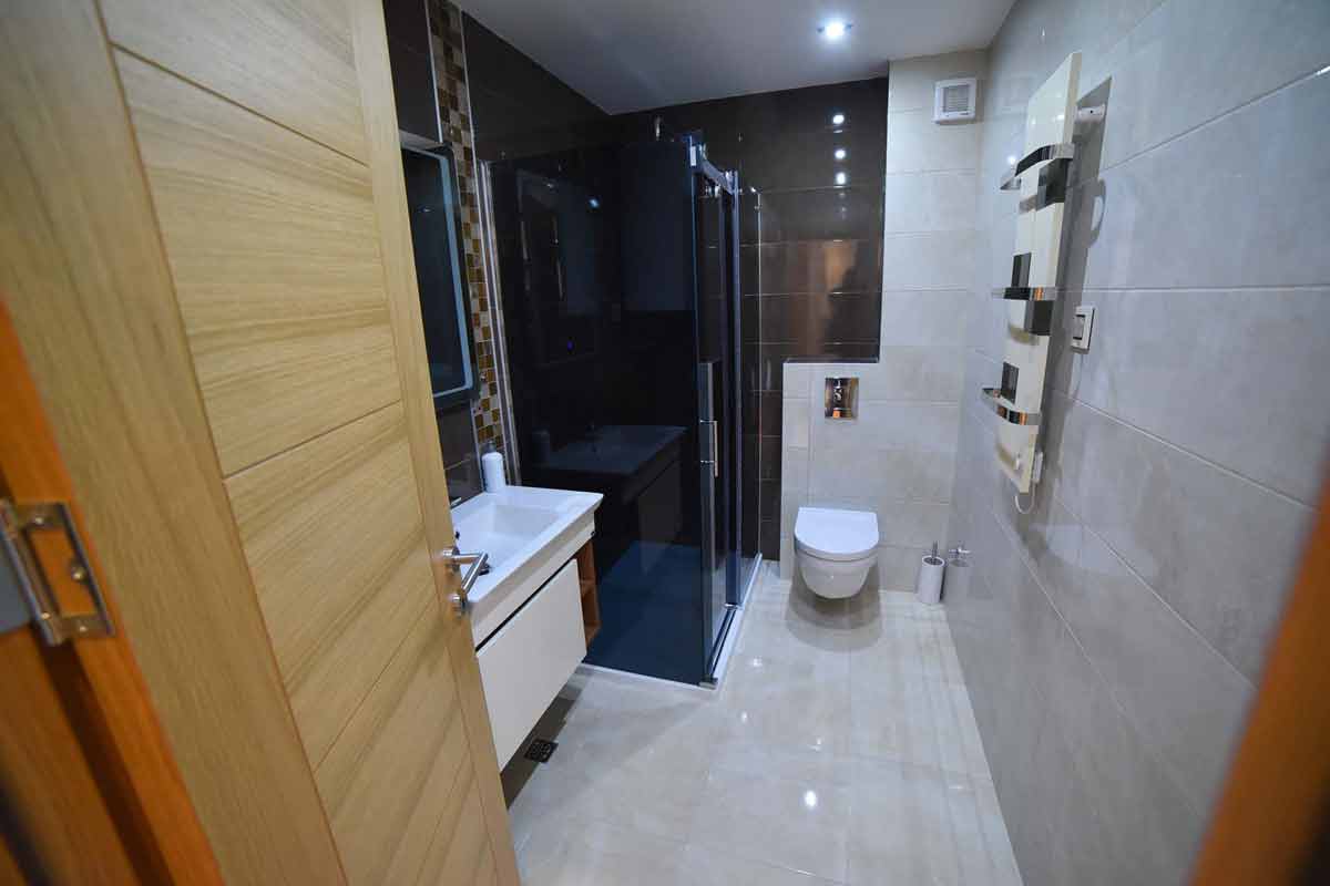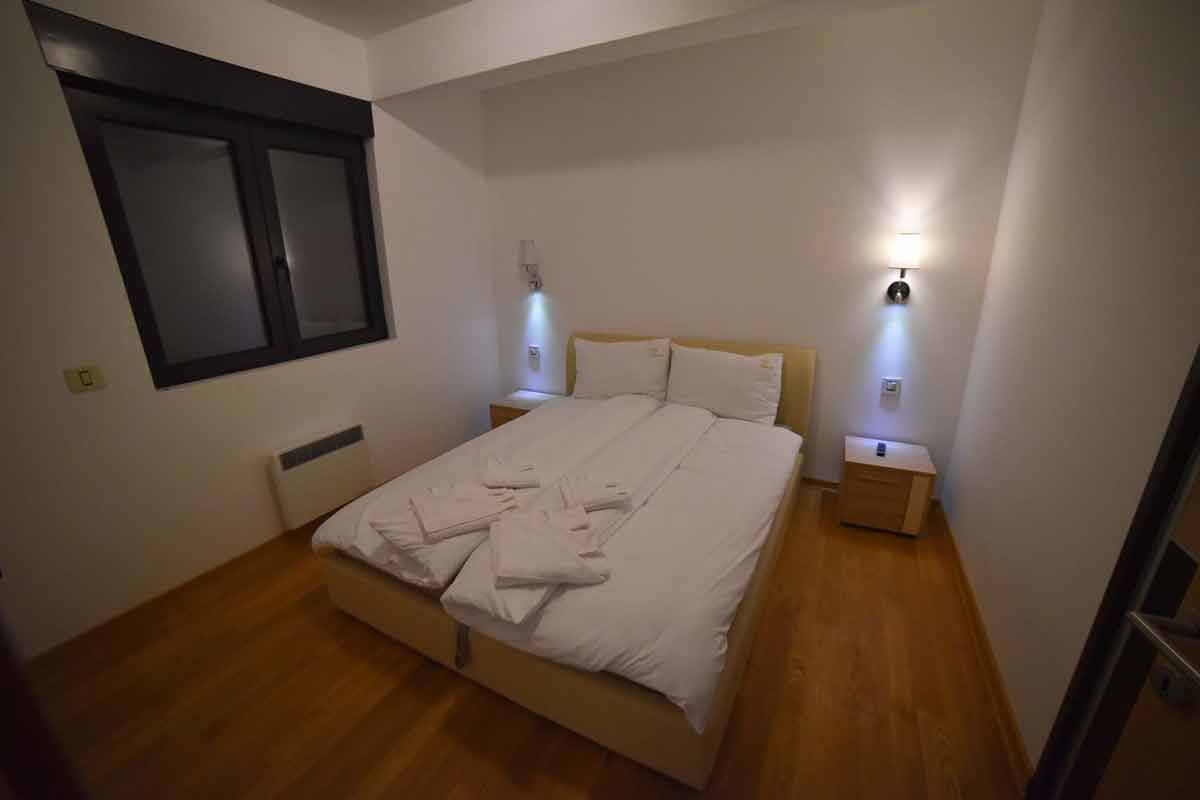 Dve spavaće sobe pružaju maksimalan komfor – savršeno namešteni kreveti, kvalitetna posteljina i topla rasveta stvaraju osećaj potpunog odmora. Moderno kupatilo sa tuš kabinom, savremenom sanitarijom i čistim linijama dodatno naglašava delux kategoriju apartmana.