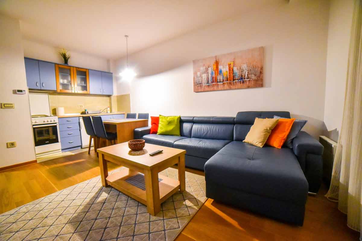 Dnevni boravak je prostran, sa velikom ugaonom garniturom u plavoj boji i detaljima u jarkim tonovima koji prostoru daju živost. Povezan je sa trpezarijom i potpuno opremljenom kuhinjom, idealnom za pripremu doručka ili lagane večere posle šetnje kroz borovu šumu.