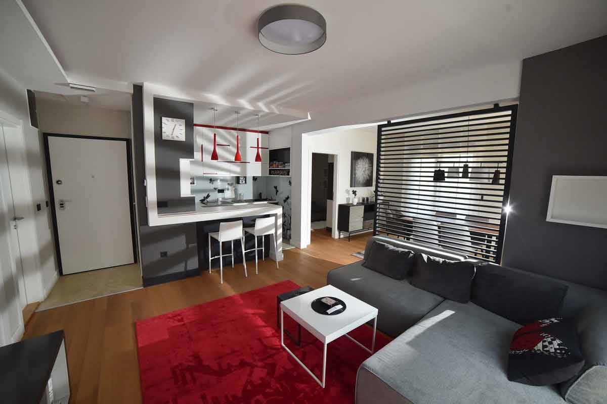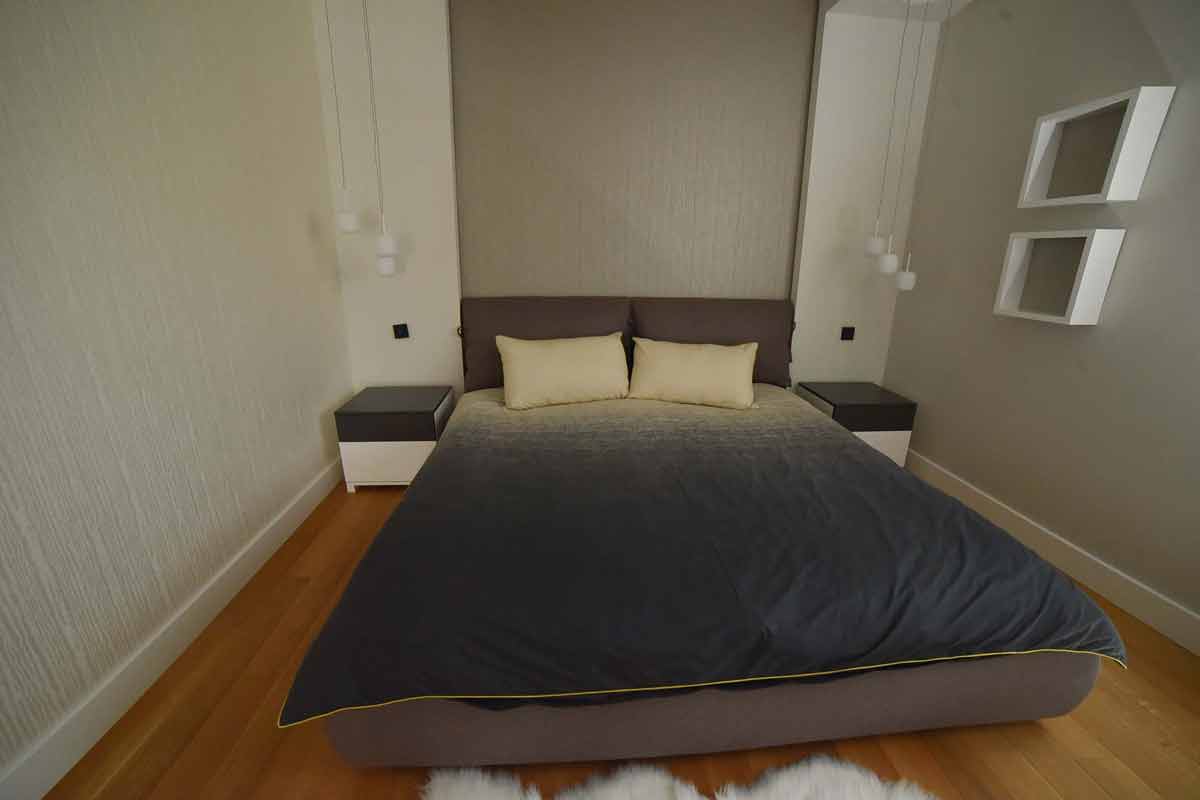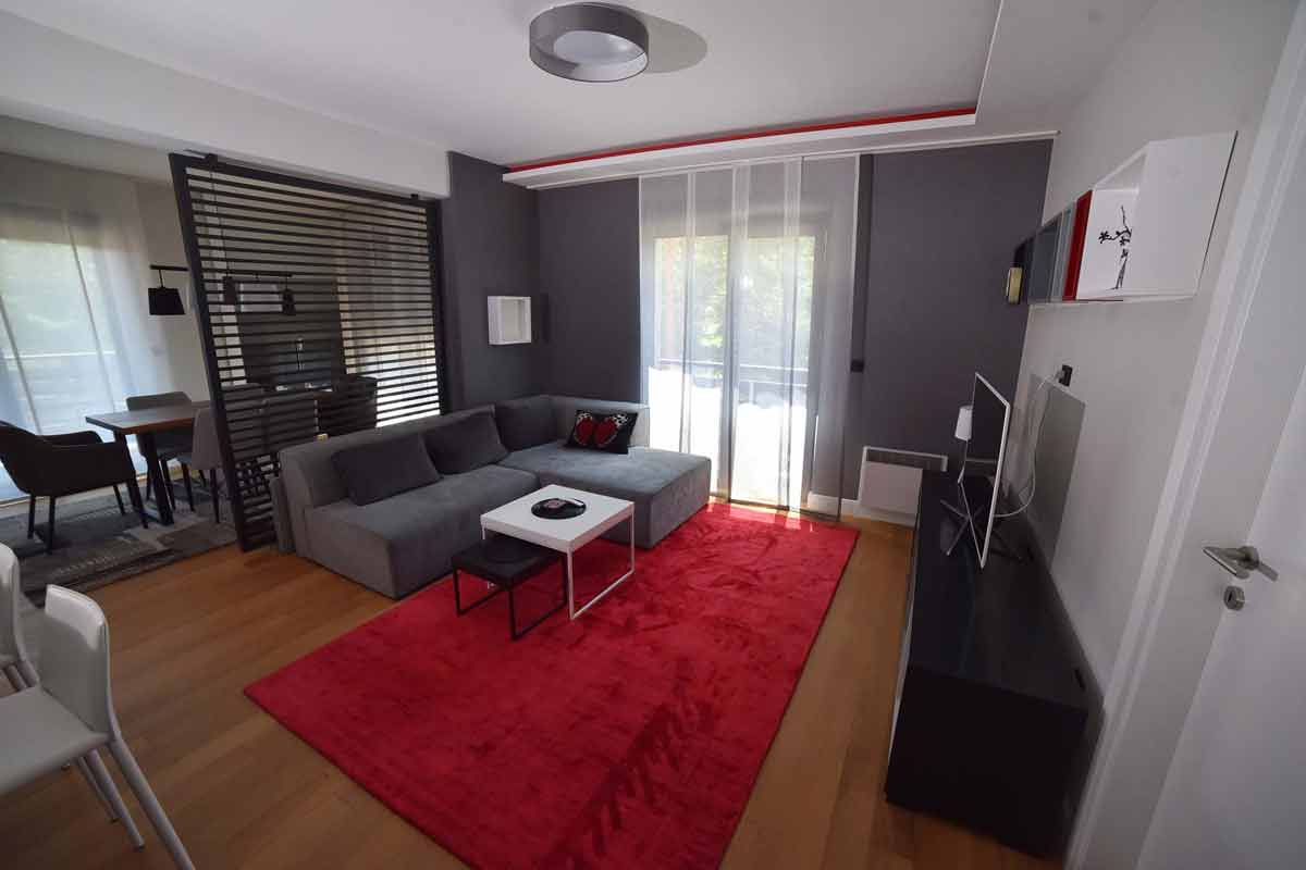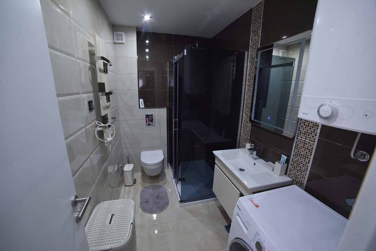Kuhinja je u potpunosti opremljena, idealna za pripremu obroka, dok trpezarijski sto i udobne stolice stvaraju prijatan prostor za zajedničke trenutke. U dnevnoj sobi se nalazi velika ugaona garnitura, smart TV i WiFi internet, što apartman čini podjednako pogodnim za odmor i poslovne posete. Spavaće sobe nude mirnu atmosferu i komforan smeštaj, a elegantno uređeno kupatilo sa tuš kabinom doprinosi osećaju luksuza.