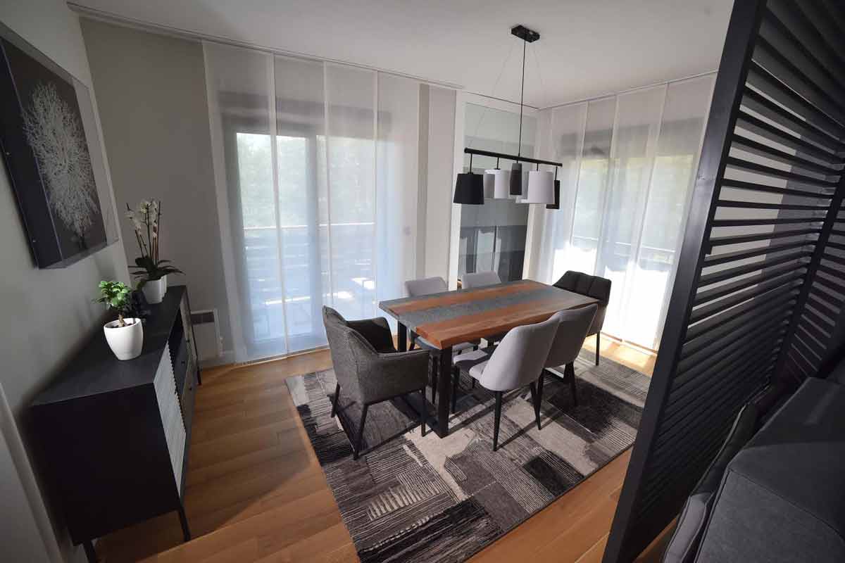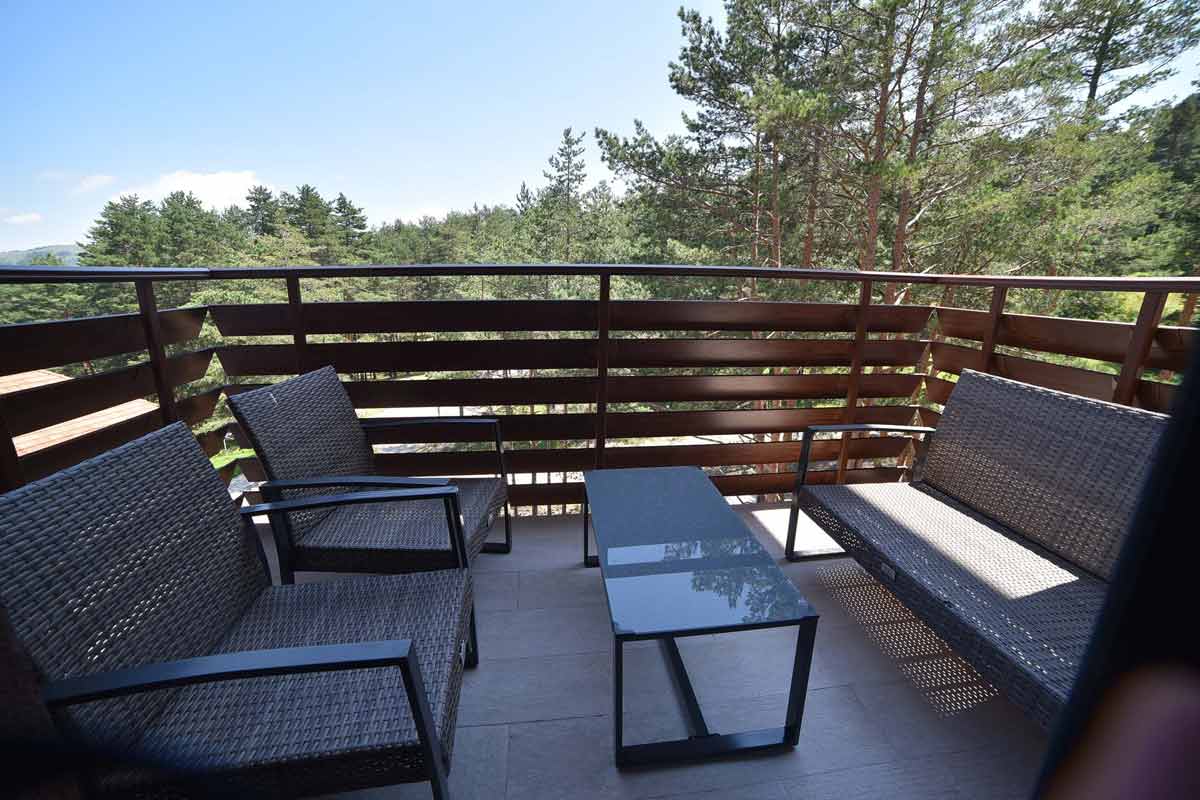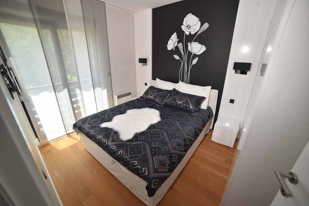 Apartman sadrži dve spavaće sobe, moderno opremljenu kuhinju, prostranu dnevnu sobu, trpezarijski deo i kupatilo. Enterijer odiše savremenim dizajnom u kojem dominiraju elegantne boje i pažljivo odabrani detalji – od ambijentalnog osvetljenja do modernih komada nameštaja. Veliki prozori i terasa pružaju prirodno osvetljenje i nezaboravan pogled na borovu šumu, dok udobna garnitura i dekoracije daju osećaj topline doma.