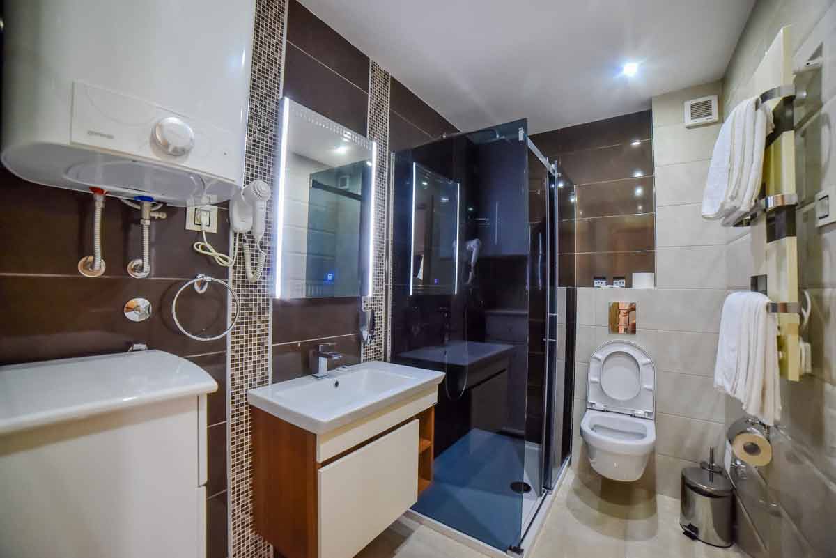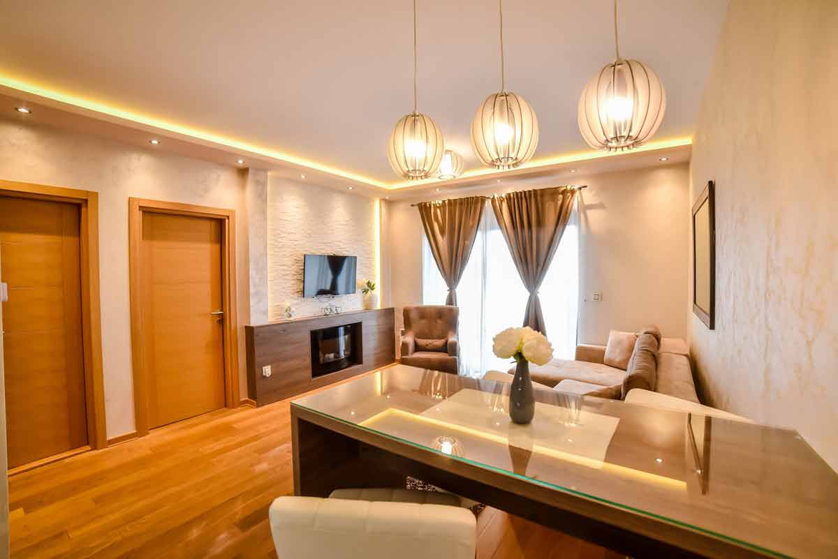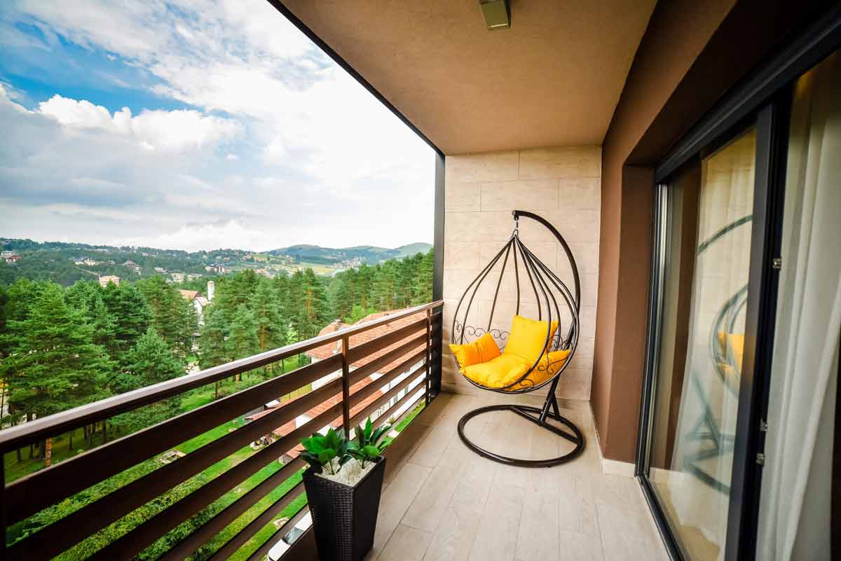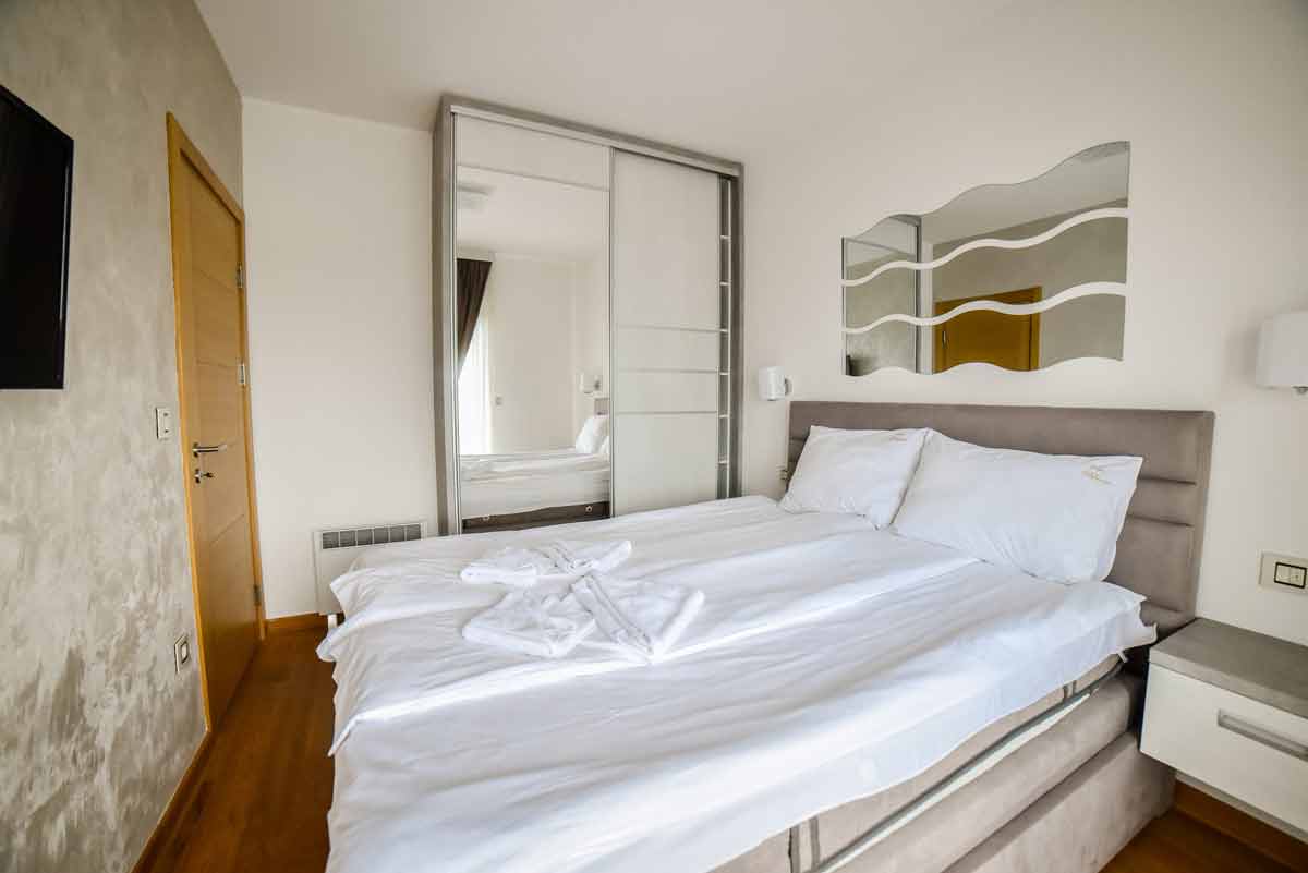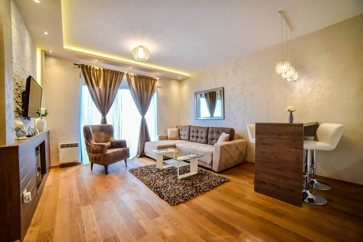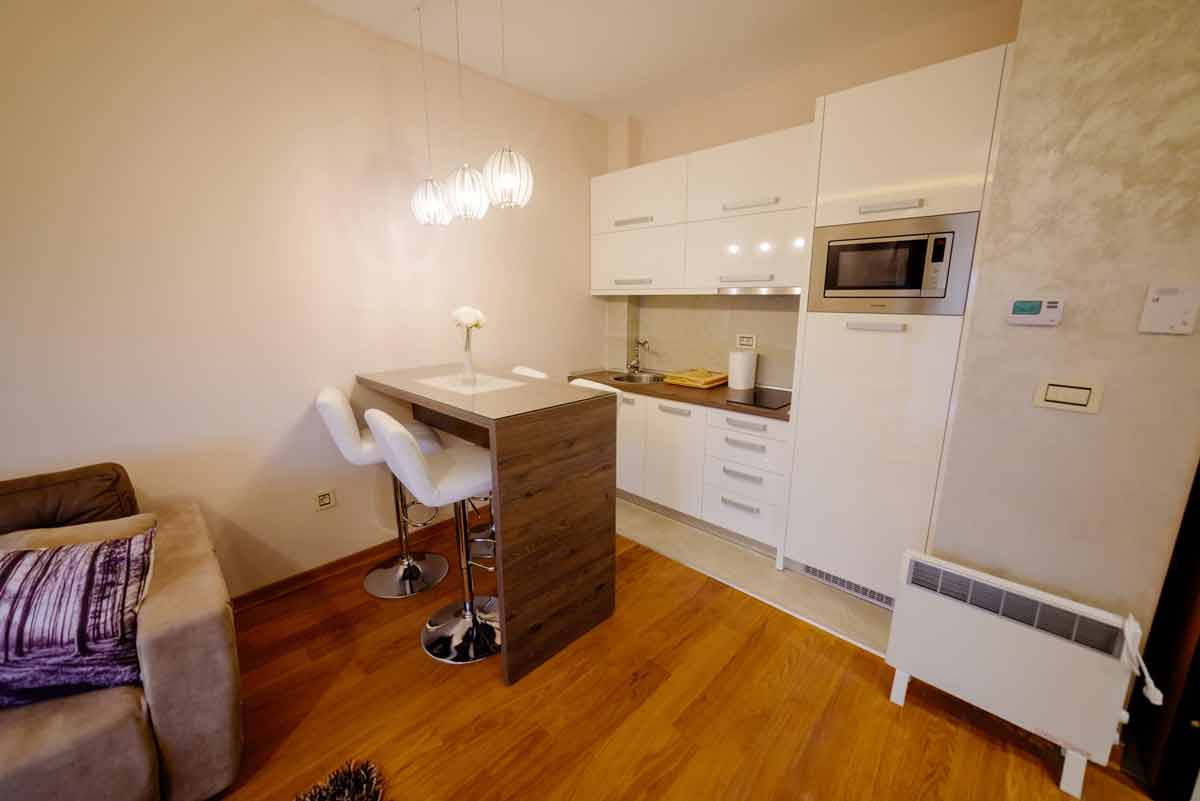 Ovaj apartman površine 46 m² nalazi se na severnoj strani objekta, a sa terase se pruža lep pogled ka centru Zlatibora. Enterijer odiše toplinom i modernim planinskim stilom – drveni pod, dekorativni kameni zid, ambijentalno osvetljenje i udobna garnitura stvaraju prijatnu atmosferu za odmor i opuštanje.