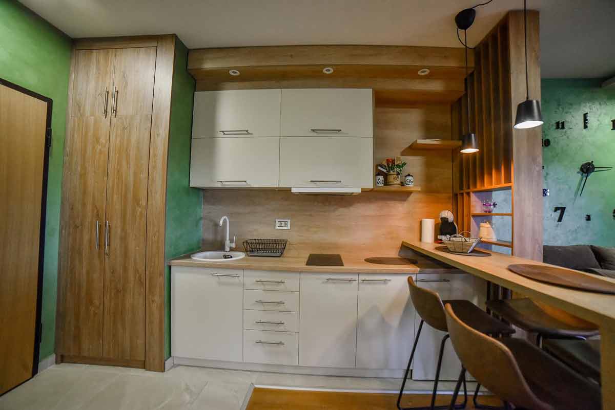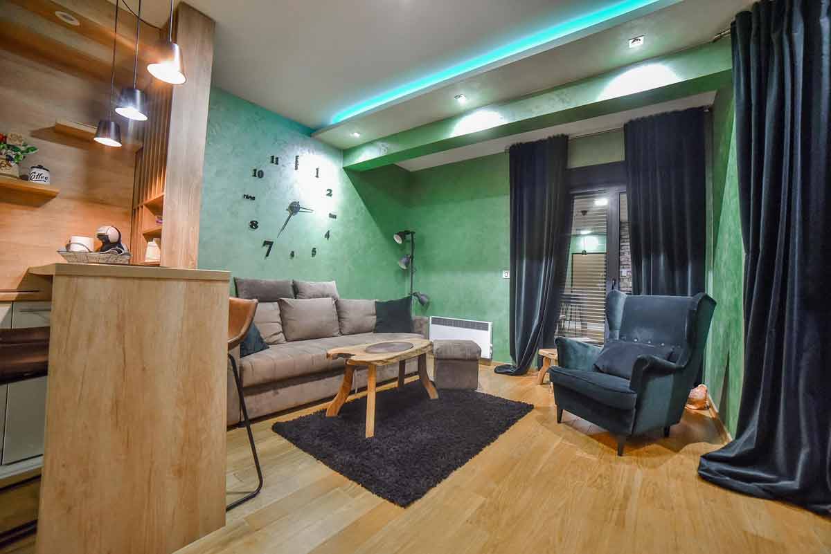 Unutrašnji prostor odiše toplinom prirodnih materijala – kombinacija drveta, cigle i modernih detalja daje apartmanu poseban karakter. Dnevna soba sa udobnim kaučem i TV-om idealna je za odmor, dok moderna kuhinja poseduje sve što je potrebno za duži boravak. Spavaća soba nudi udoban bračni krevet i izlaz na terasu sa panoramskim pogledom, a kupatilo je opremljeno modernim tuš kabinama i fenom.