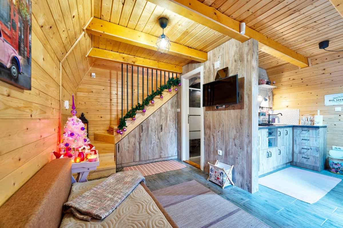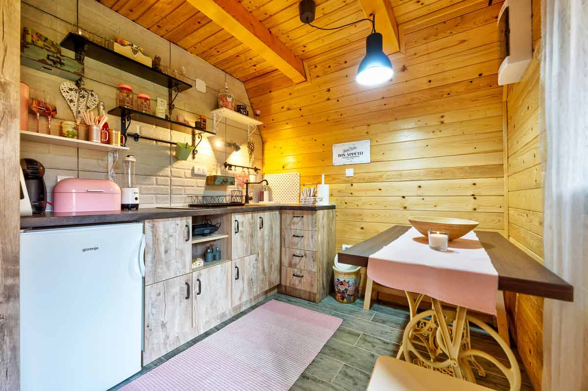 Jedan od detalja koji naši gosti najviše cene tokom zimskih meseci je podno grejanje. Nema lepšeg osećaja nego šetati bos po toplom drvetu dok napolju veje sneg. Potpuno opremljena kuhinja i trpezarija omogućavaju vam da sami kreirate svoje male gastronomske rituale, bilo da je u pitanju bogat zlatiborski doručak ili romantična večera uz vino.
